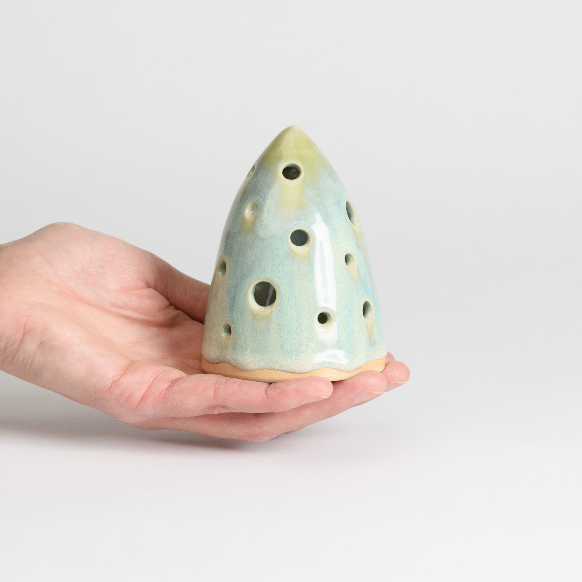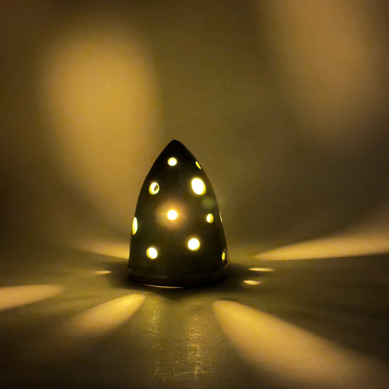 This Christmas tree is thrown on the wheel and carved by hand. With holes to let light through.