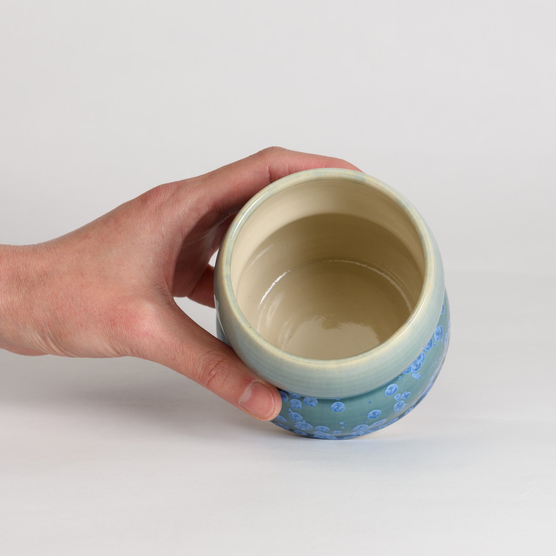 Glazed with a beautiful, crystalline glaze, each cup features a unique pattern of blue crystals set against a teal background. No two are ever the same!