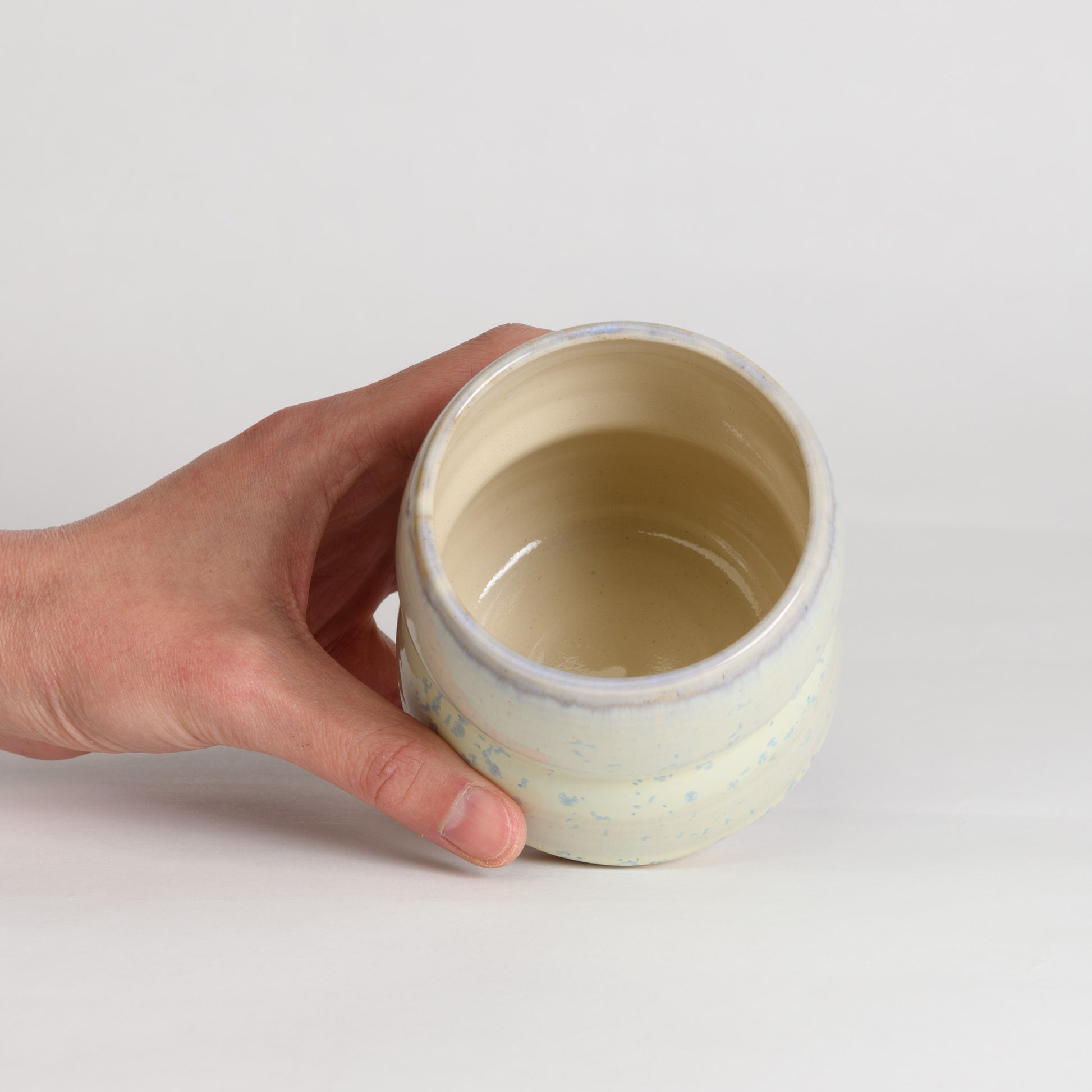 Glazed with a beautiful, crystalline glaze, each cup features a unique pattern of baby blue crystals over a multi-tonal green, blue and cream background. No two are ever the same!