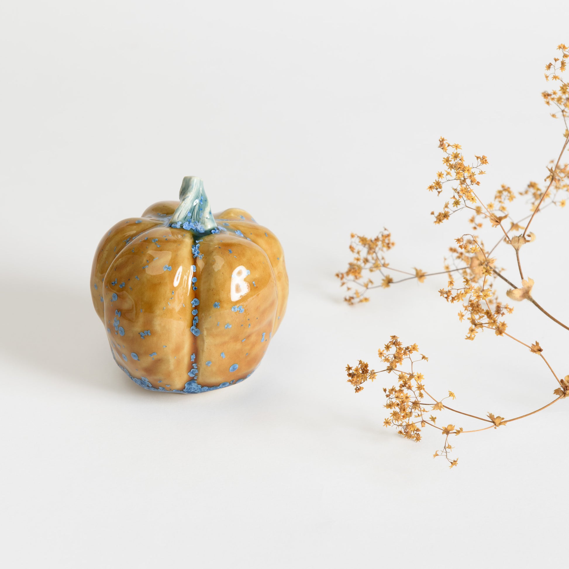 Hand-sculpted pumpkin featuring an amber body with blue crystals and a teal stem.