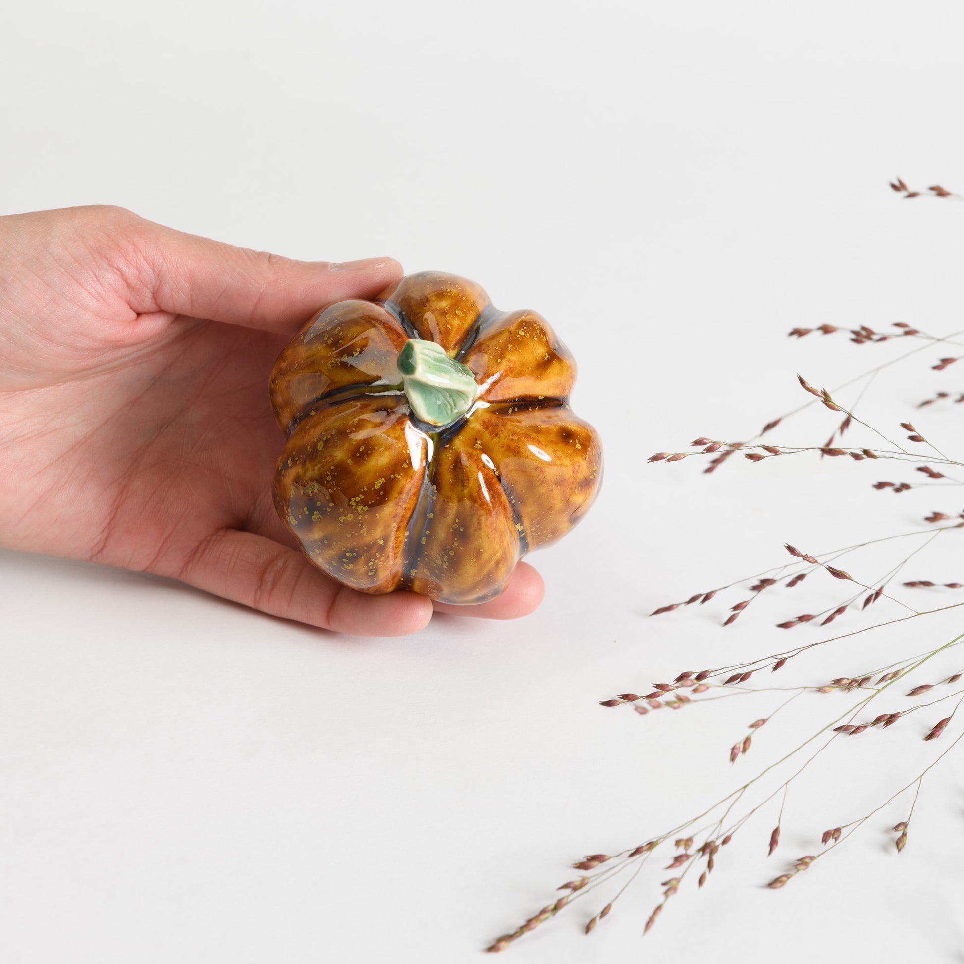 Hand-sculpted pumpkin featuring a rich caramel body with golden crystals and a green stem.