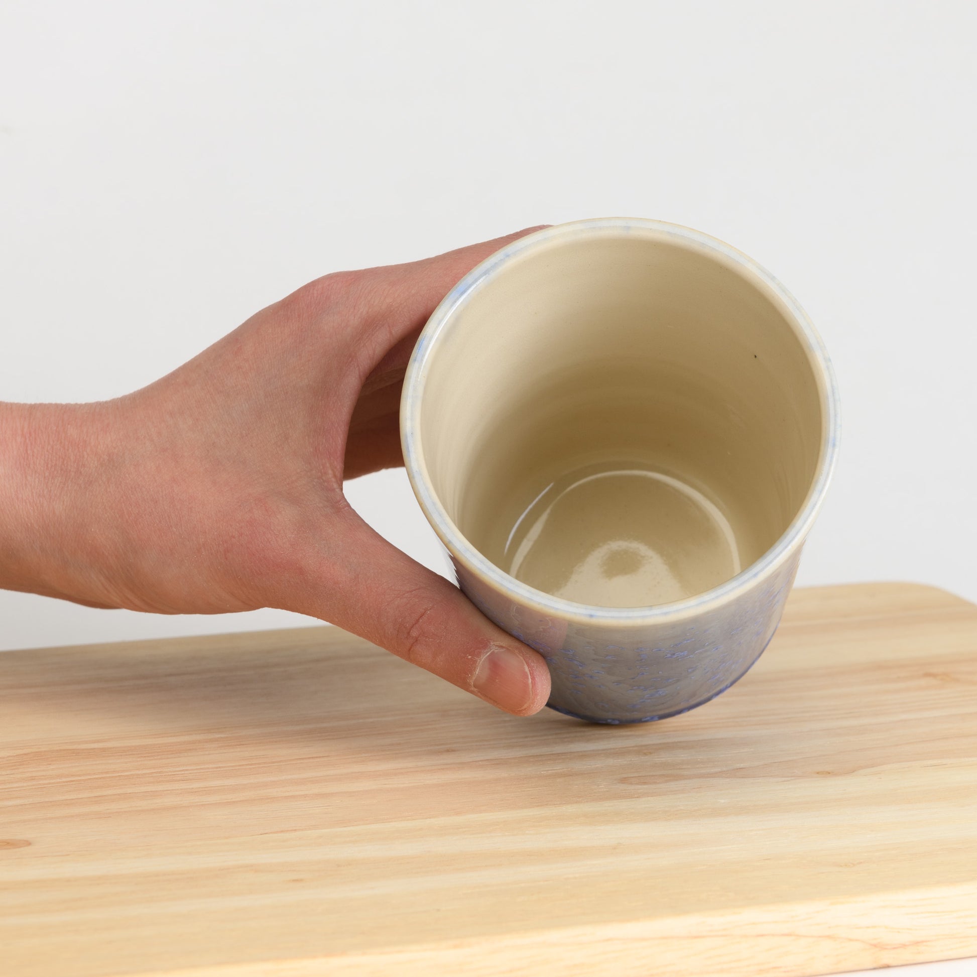 Glazed with a beautiful crystalline glaze, each cup has a unique pattern of blue crystals over a blue background. No two are ever the same!