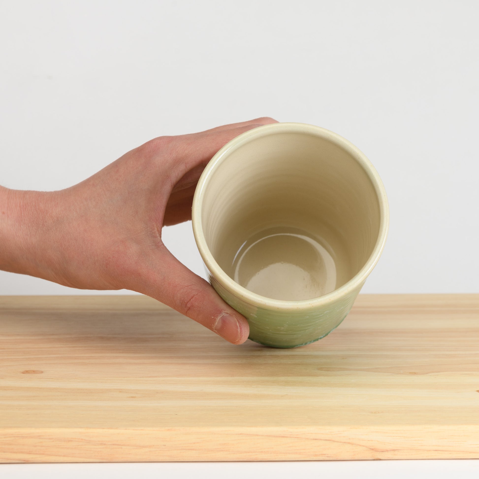Glazed with a beautiful crystalline glaze, each cup has a unique pattern of crystals over a mint green background. No two are ever the same!