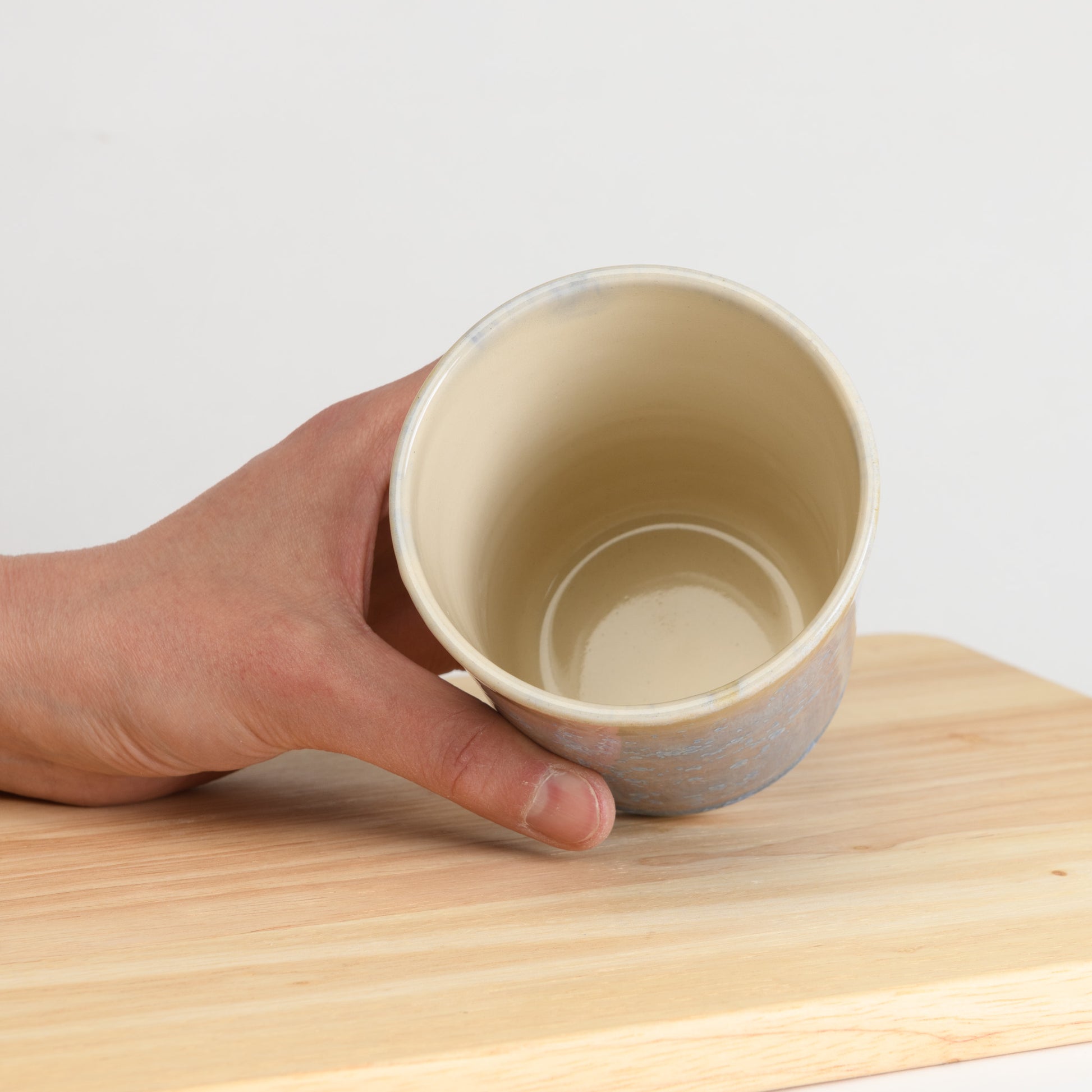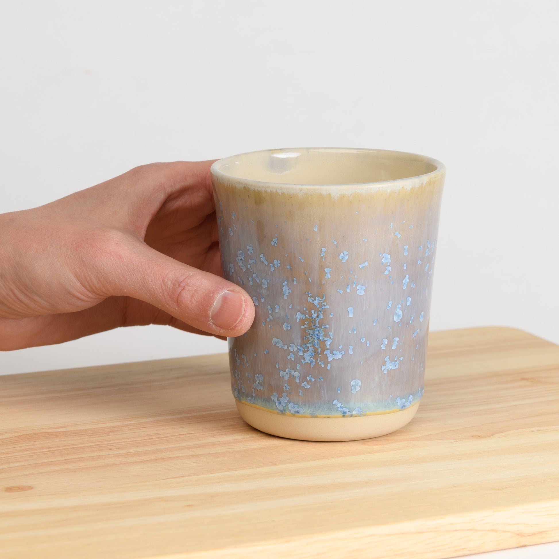 Glazed with a beautiful crystalline glaze, each cup has a unique pattern of baby blue crystals over a multi-tonal purple, blue and cream background. No two are ever the same!